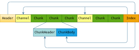 - Channel信息是在本通道首次上线(被监听的Writer创建的时候)的时候才写入到文件中,这就导致Channel在文件中的位置是不确定的。比如打算录制a和b两个通道的消息,a通道一开始就在线,b通道过了很久才上线,这种情况下录制文件的结构是:Header、a的Channel信息、a的若干个Chunk,然后才是b的Channel信息。所以,Channel的读取需要依赖Index建立的索引。