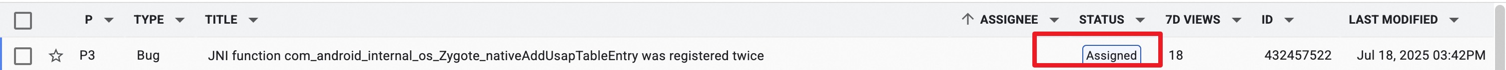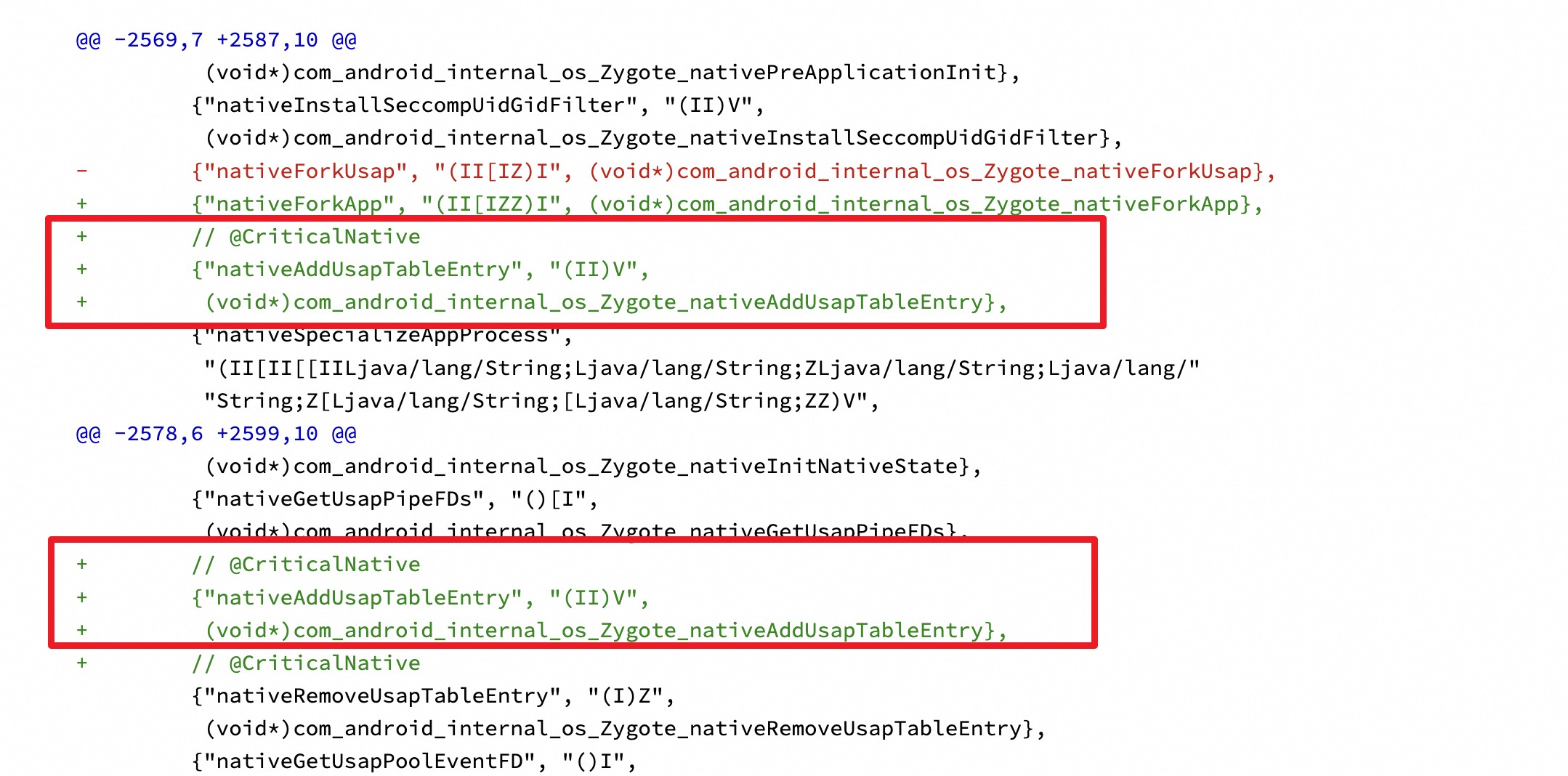 可以看到,这个patch中重复注册了JNI函数com_android_internal_os_Zygote_nativeAddUsapTableEntry: