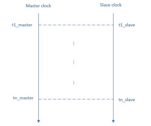 相对时间同步,要求从时钟的频率和主时钟一致。我们可以通过下面的方式估算晶振的变化,并动态调整。 如下图所示,分别在t1、tn时刻对主时钟和从时钟进行采样,采样值分别记为t1_master、tn_master、t1_slave、tn_slave,可以得到下面的比例: