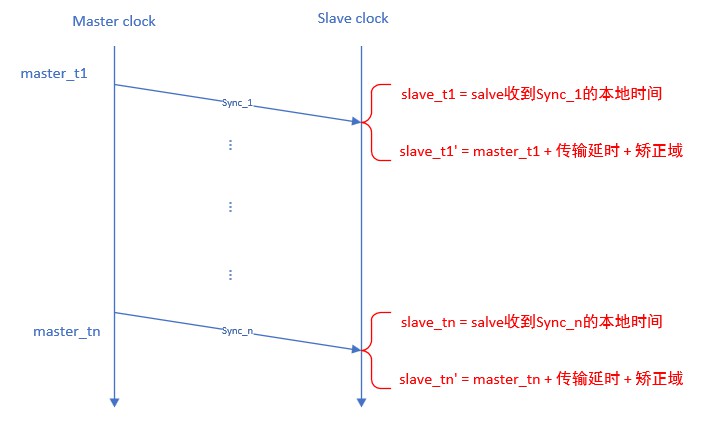 - slave_t1:接收到Sync_1信号时,slave本地时钟的值,这个值是当前时刻在slave时间坐标系下的采样