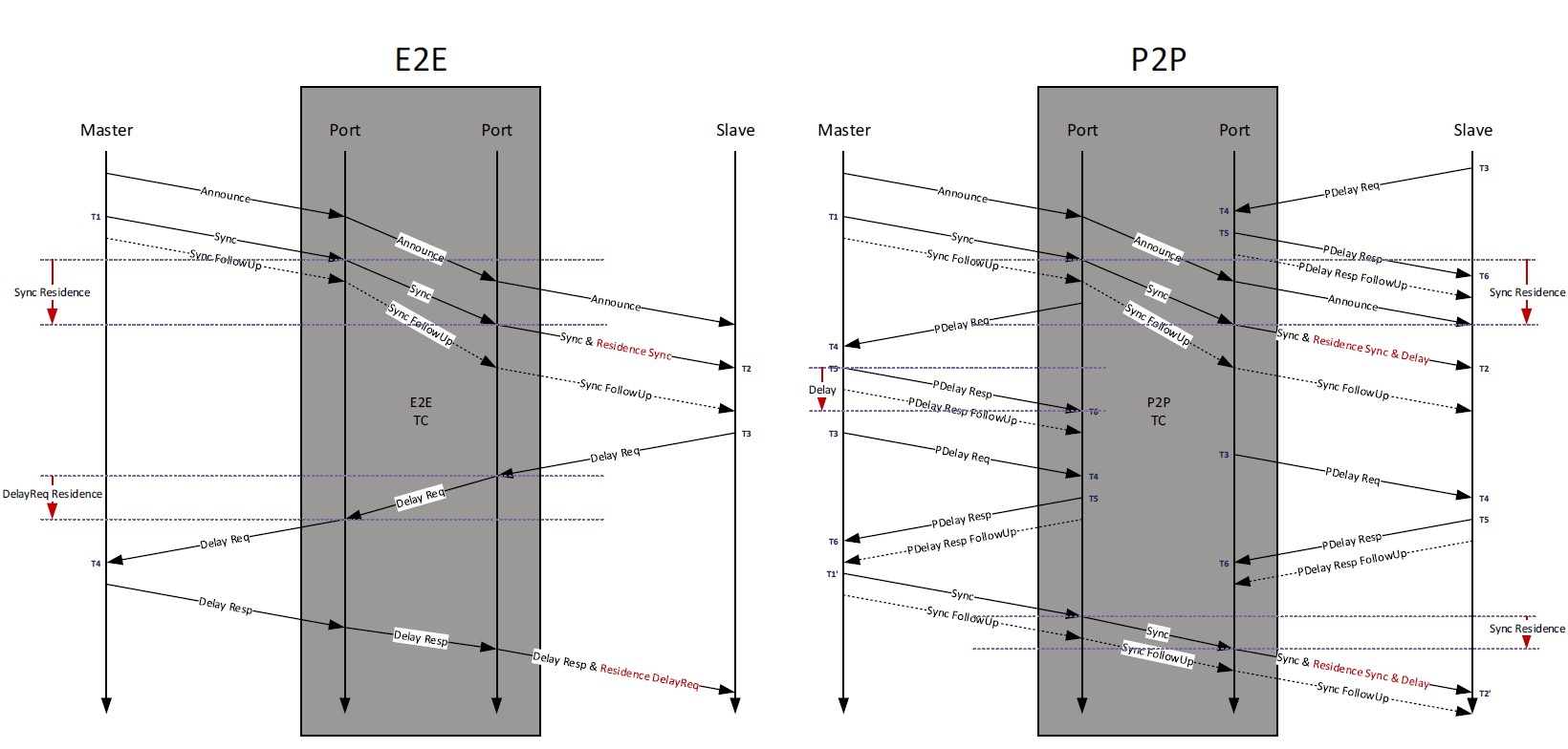 IEEE 1588支持两种路径延时测量方式:End-to-End(E2E) 和 Peer-to-Peer(P2P),二者不能在同一个网络中共存。