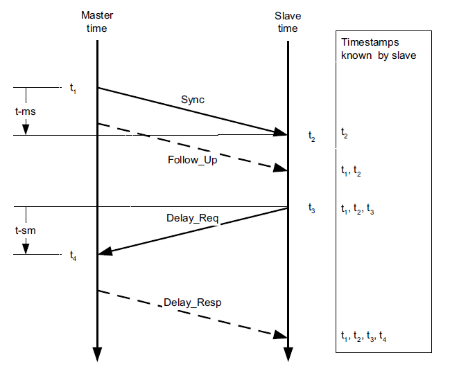 - 主时钟在t1时刻发送Sync命令,从时钟在t2时刻收到同步指令。这时候从时钟并不知道主时钟是在什么时候发出这个Sync命令的,但是知道自己是在t2时刻收到该命令的。