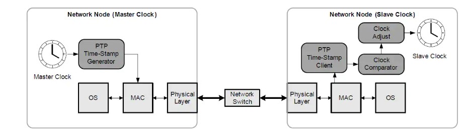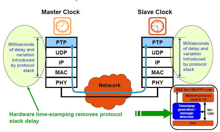 - 从上图可以看到,比较合适的采集点就是MAC层:在发送方,当报文离开MAC层进入PHY层的时候记录当前时刻;在接收方,当报文离开PHY层刚到达MAC层的时候记录当前时刻。这样可以消除协议栈带来的不确定性。
