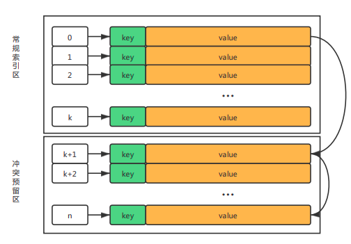 - 预留区的空闲节点也可以组织成一个单向链表(空闲存储单元链表),当遇到Hash冲突时从该链表摘取节点,当节点不再使用的时候,再归还到该链表中