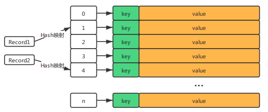 初步想法是将整块共享内存划分成一个下标为0~n的数组,如下图所示。数据Record的key经过Hash计算后得到hashcode,然后将该值映射为数组的下标,直接通过下标访问数组,将Record的key和value存储在对应的位置。