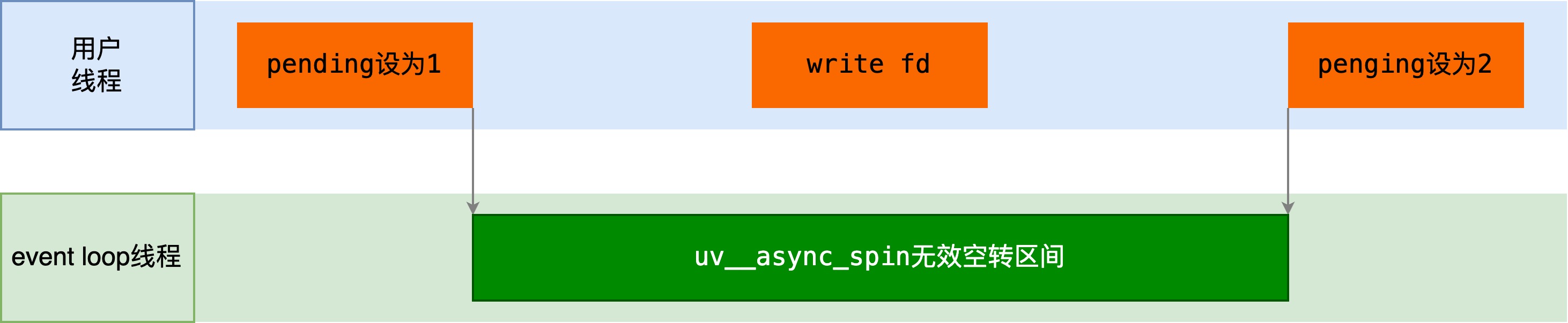 handle->pending当前的值是1,啥也不干,返回当前值1;(意思是uv_async_send正在被调用),注意这种情况下uv__async_spin会一直等待直到handle->pending的值变为2,即uv_async_send调用结束,这为本文描述的bug埋下了伏笔。