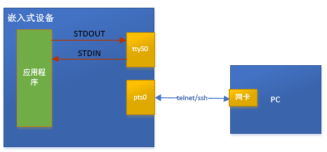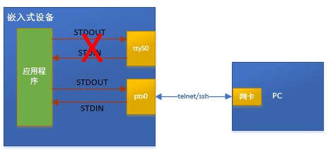 如下图所示,重新绑定后,打印就可以直接输出到telnet或者ssh对应的控制台,经由网络传输到PC上;同时,也可以从PC上接收输入(如果应用程序监听了STDIN,PC上的输入就可以直接被应用程序读取到,不重定向的话是收不到的)。