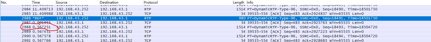 分析抓包文件,可以看到RTP序号18492和18493之间有个500多ms的间隔(18492和18491在同一个TCP报文中,wireshark并未显示出18492),而这期间接收端的窗口都是OK的,也就是说发送端导致了这个间隔。排查发送端代码,果然有个分支会sleep 500ms,某些情况会走到该分支。