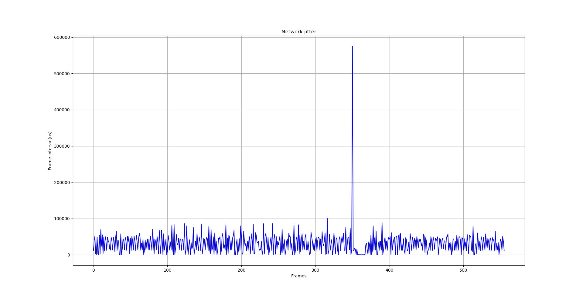 pyhton analyse.py src[192.168.43.252[554]]--dst[192.168.43.1[39535]].txt可得到下图所示分析结果。图中横坐标代表帧,纵坐标代表帧间隔,单位是us。如下图所示,有一个帧间隔达到了500多ms,肯定会导致卡顿现象。