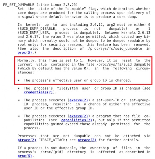 项目中遇到一个问题,某个进程已经通过prctl(PR_SET_DUMPABLE, 1)将其设置为dumpable,但还是无法生成coredump,其他进程能生成,说明系统配置没问题。最终查下来发现,是因为该进程变更uid/gid导致的。