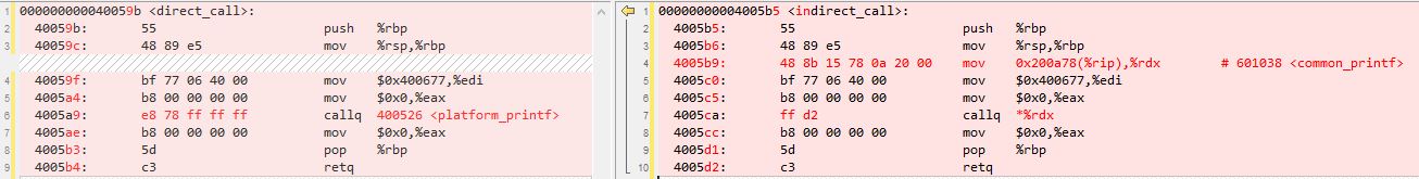 x86-64架构下的反汇编如下图所示,可以看到,间接调用比直接调用多了1条指令。